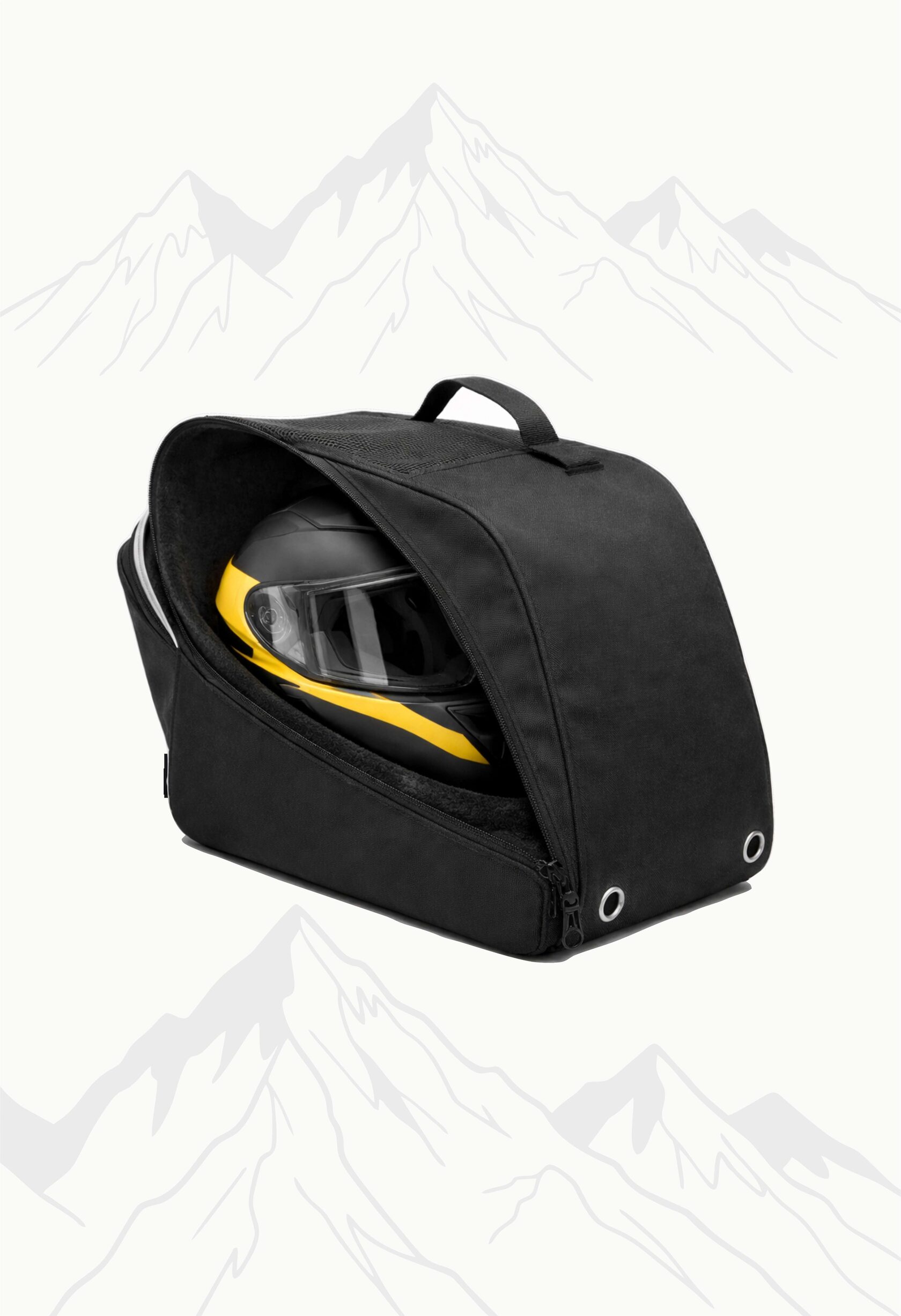 Любой дизайн. Внутри, для лучшей сохранности шлема — мягкий материал; Снаружи плотный, неубиваемый Оксфорд. Сверху сеточка и 4 люверса по бокам, для самой оптимальной вентиляции. Для переноски используется ручка.